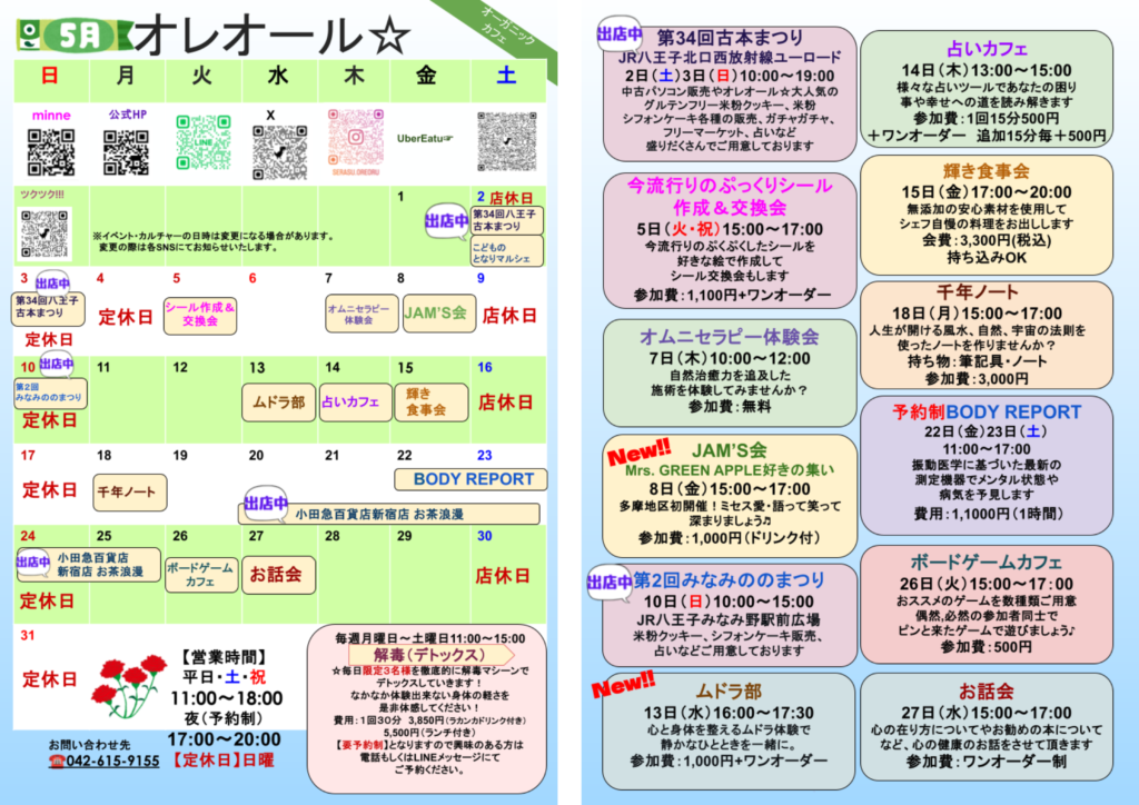 5月は店舗を飛び出して、マルシェなどに出店いたします。また、8日の「JAM’S会」や13日の「ムドラ部」など、今回が初開催のイベントもあるので、ぜひご興味があればご参加してください。