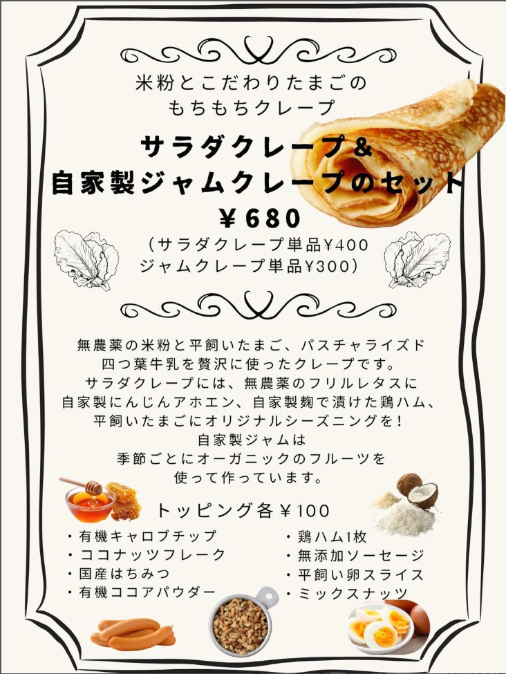 メニューはサラダクレープと自家製ジャムクレープの2種類をご用意いたします!